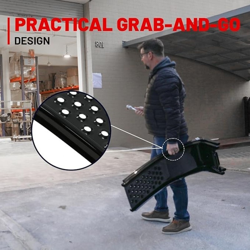 DESIGN GRAB & GO: pesando apenas 15 kg, as rampas de carro são leves e fáceis de mover. As ranhuras em ambos os lados tornam super fácil de pegar e usar, seja levando-as para o porta-malas do carro ou colocando-as de volta no armazenamento.